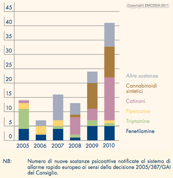 Attualmente, queste nuove sostanze rappresentano una sfida agli approcci per il monitoraggio e il controllo delle sostanze psicoattive, soprattutto per la natura sempre più dinamica dell’offerta delle alternative ai prodotti controllati. Tra il 1997 e il 2010 sono state notificate tramite il Early Warning System europeo, più di 150 nuove sostanze psicoattive (acquistabili in più di 600 online shops), con un picco nel 2009-2010, in cui ne sono state denunciate rispettivamente 24 e 41, tutte sintetiche. Fino a novembre 2011, ne sono state identificate formalmente 39: esse sono perlopiù catinoni o cannabinoidi sintetici.